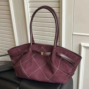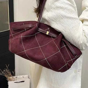 Rich in texture and effortlessly stylish, this oversized diamond stitch tote is the perfect blend of casual elegance and everyday practicality. Crafted from soft faux suede in a lovely burgundy color, with gathered/ruched side detailing and diamond stitch detail with contrast stitching.