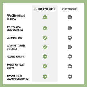 Float2infuse was founded by Samantha, who designs and assembles the steepers in the US. 25% of the profits are donated to special education initiatives. Discover the ultimate tea infuser with our patent-pending Floating Tea Steeper! Designed for versatility, it fits seamlessly into any size drinkware, allowing you to steep up to 1 tablespoon of your favorite tea, anytime and anywhere, whether you desire a warming cup or a chilled infusion.